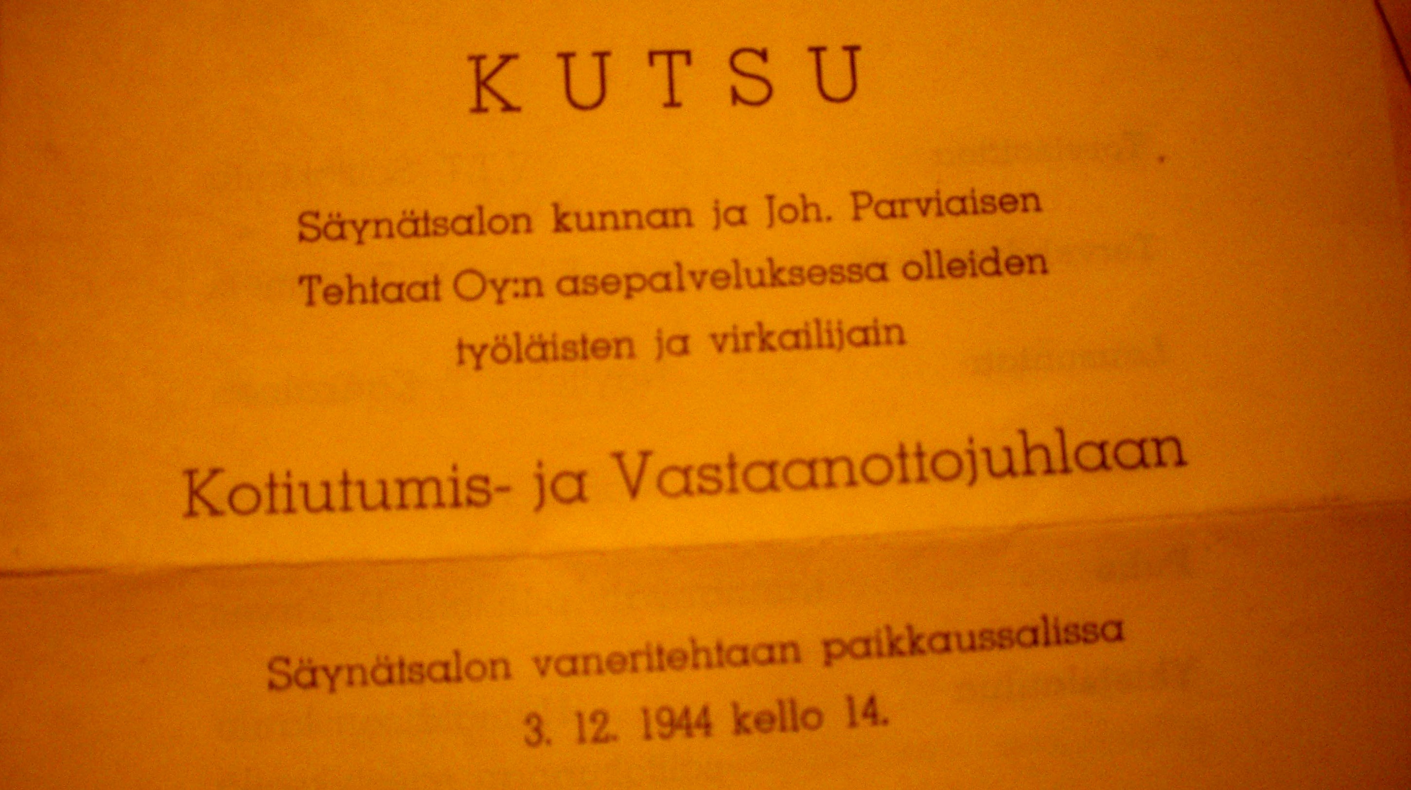 Vanerin paikkaussali oli saarten suurten juhlien toteuttamispaikka 40-luvulla. 3.12.1944 siellä järjestettiin oheisen kutsun kertoma Kotiutumis- ja Vastaanottojuhla sodasta selviytyneille ja saarille palanneille. Sekä työläisille että virkailijoille yhteisesti. Juhlan järjestäjänä olivat Parviaisen Tehtaat Oy ja Säynätsalon kunta. Enso ei vielä tuolloin ollut saarelle omistajaksi saapunut. Tarkkaavainen lukija huomaa myös, että seurakunta ei ole kutsujien joukossa.