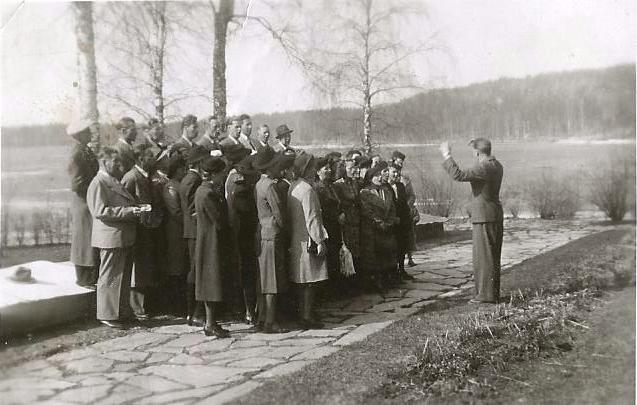 ”Saaren Laulajat” kävi vappuna 1945 laulutervehdyksellä Johtajan huvilalla. Arvatenkin tri Brommels perheineen on kuvan ulkopuolella kuuntelemassa. Talvi oli ollut raskaan henkisen muutoksen aikaa etenkin entisille suojeluskuntalaisille ja lotille, joita tuossa kuorossa oli paljon mukana.