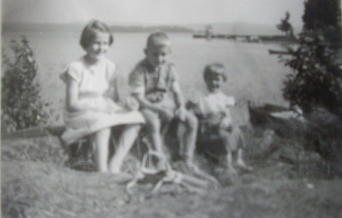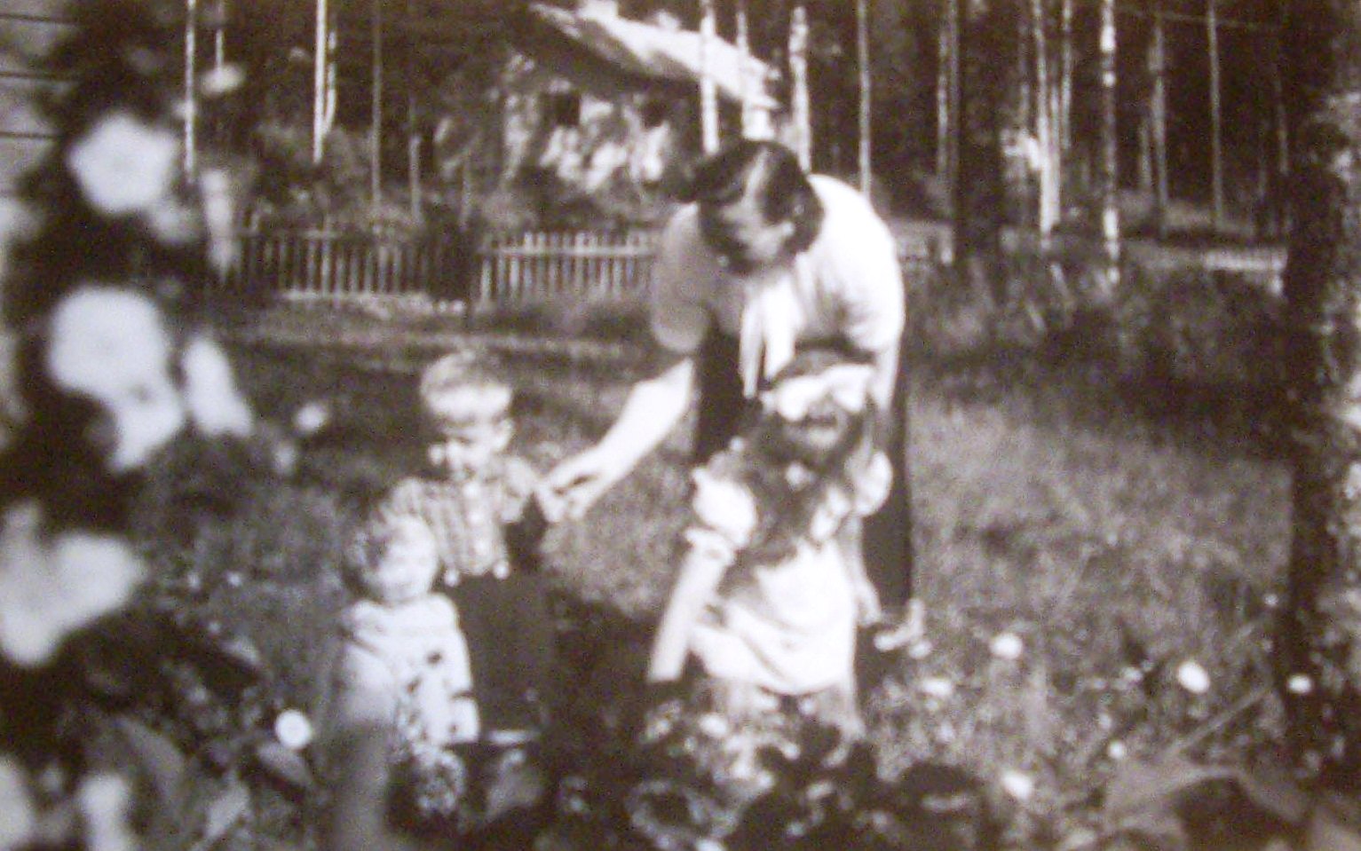 Salme lasten kanssa pihalla 50-luvun alkupuolella. Takana mäellä Puustelli.