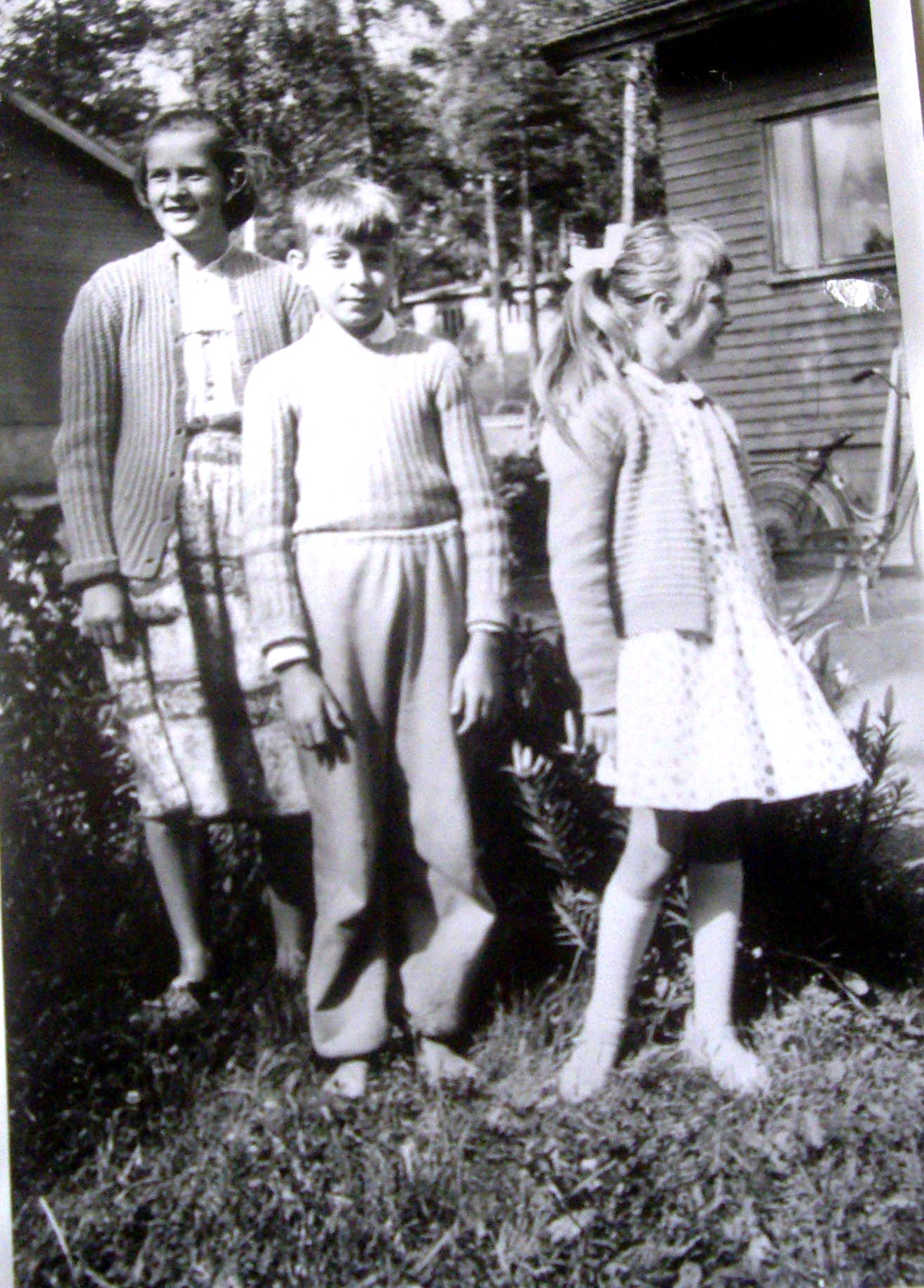Kodin pihalla 50-luvun lopulla. Kuva palauttaa mieleen sattumoisin sen, että P-korven talot olivat pitkään ilman varsinaista maalia, mikä näkyy laudoituksessa. Yhtiö kai säästi.
