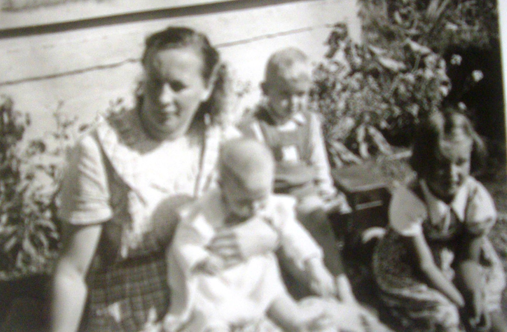 Salme  lasten kanssa pihalla  50-luvun alkupuolella. Takana mäellä Puustelli.