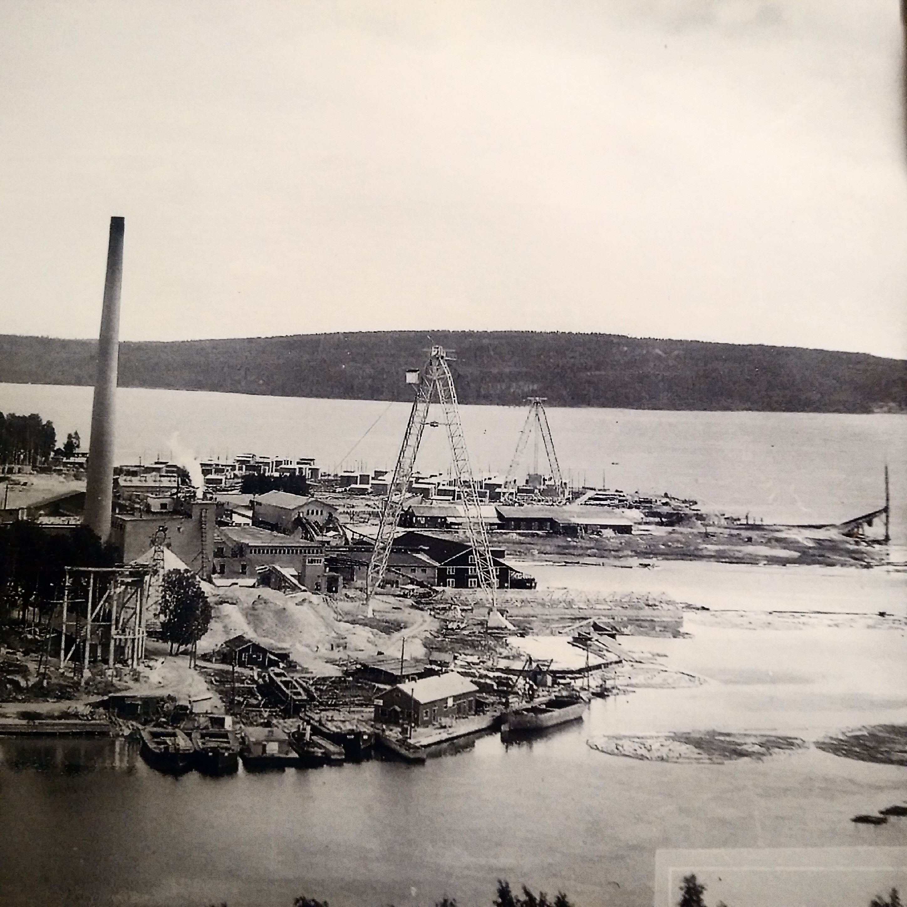 Kaapelinosturin tornit tehdaslueen kuvassa 1960-luvun alussa. Itäpään torni liikkui kiskoilla pitkälle oikealla näkyvään niemeen. Varsinainen nosturilaite liikkui mastojen välisisessä kaapelissa. Sen alkuperäinen tehtävä oli nostaa tukkinippuja sahan ja vanerin altaasta, mutta nosturilla tehtiin paljon muutakin hyödyllistä, mm konevian saanut kantosiipialus Tehi nostettiin vedestä ilmaan ja sitten itätornia liikuttamalla rannalla odottaneiden korjaajien katsottavaksi. Kuva: Kaarlo Kaltialan arkisto.