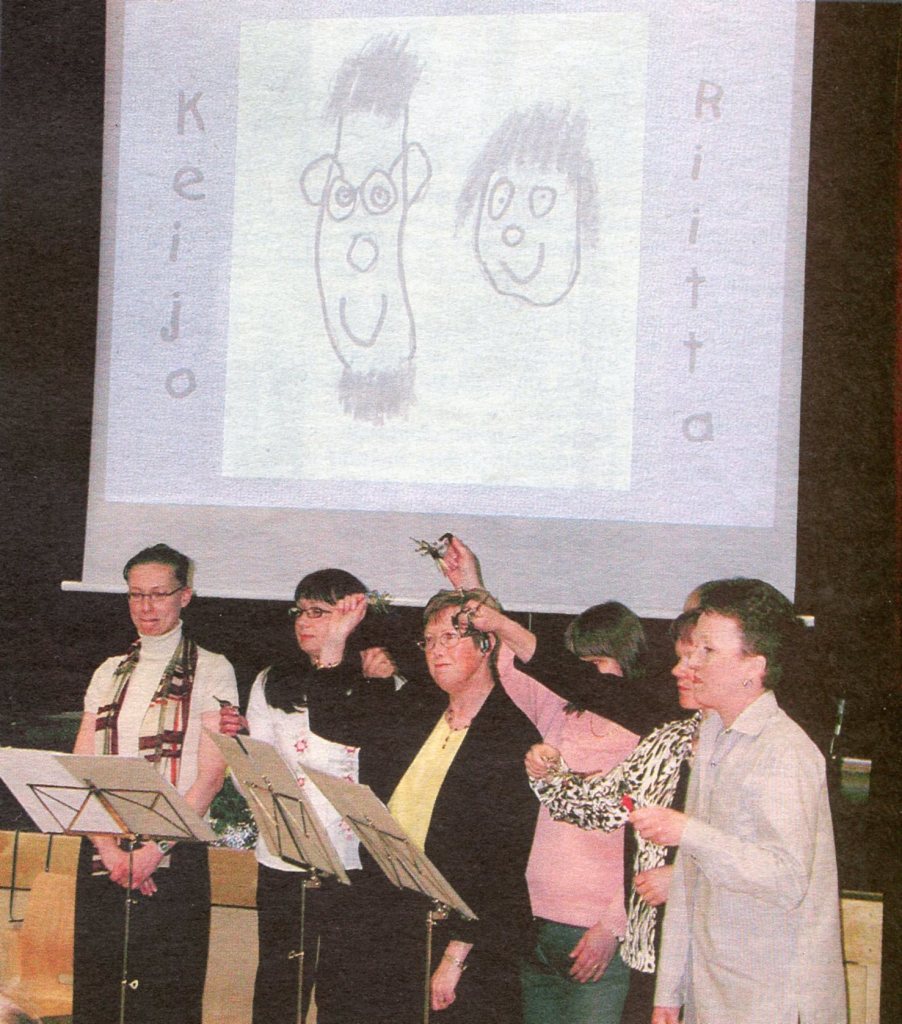 Koulun henkilökunnan lauluesitys Merosten läksisäisjuhlassa maaliskuussa 2005.