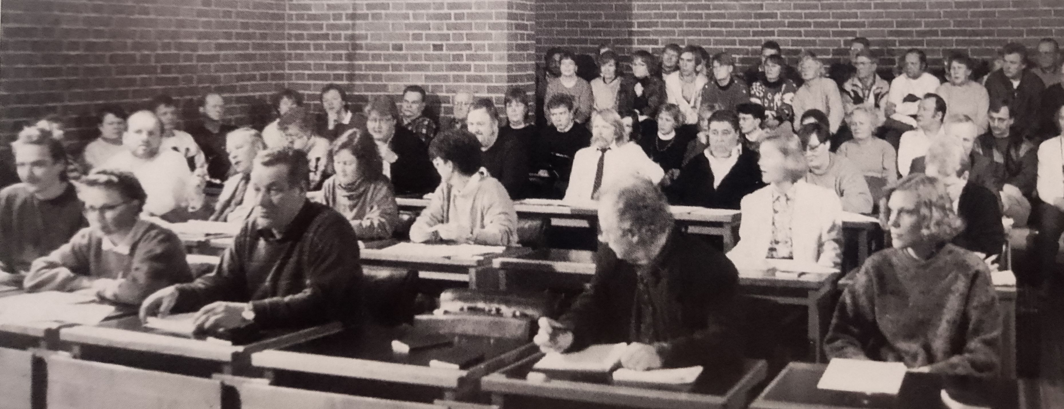 Säynätsalon valtuusto päättämässä kuntaliitoksesta 30.1.1992 Toikkanen näkyy kolmannella rivillä, valkopaitaisesta Kauko Isomäestä vasemmalle.