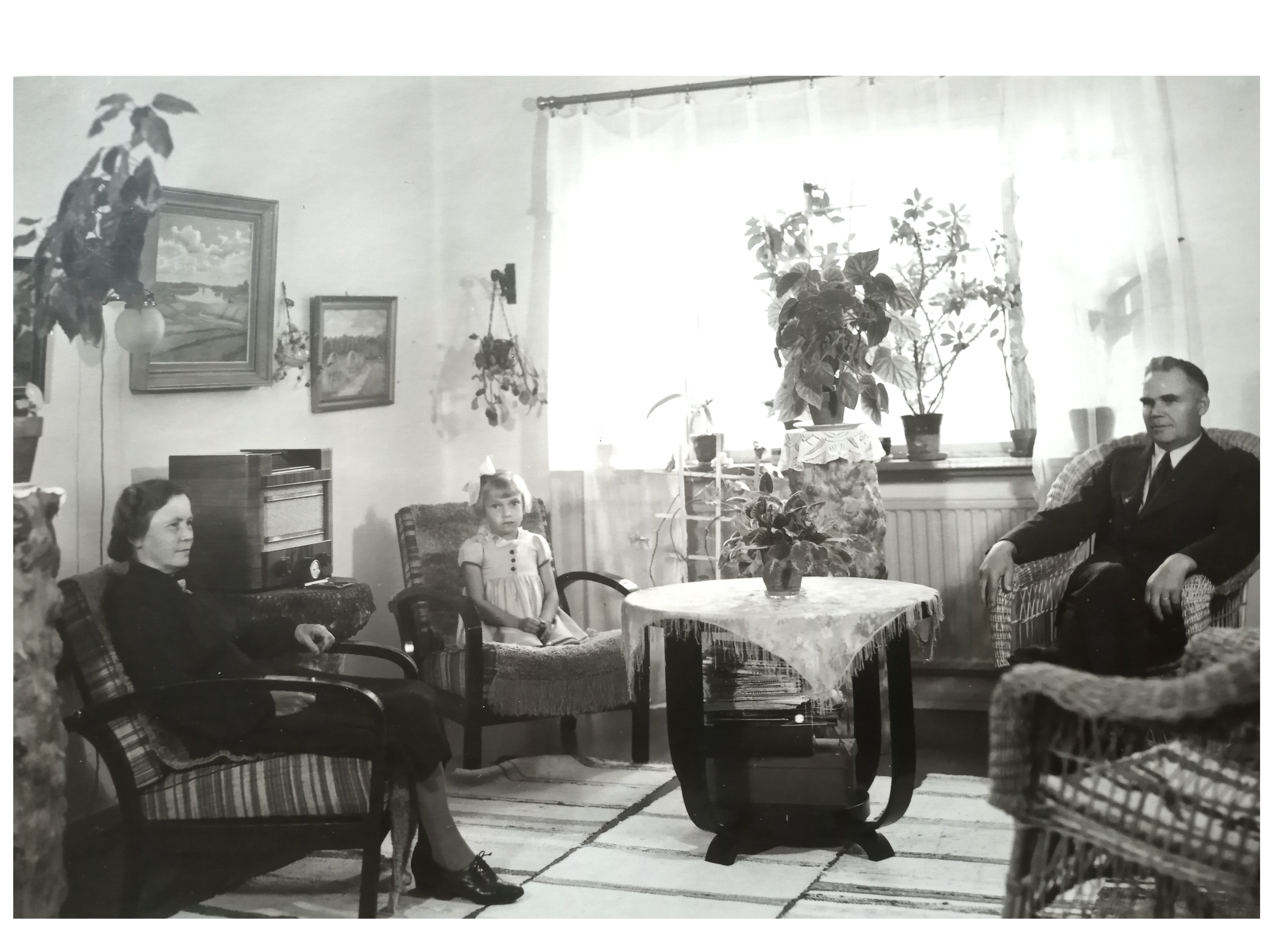 Säynätsalon ylemmän keskiluokan arkea insinööri- ja pankinjohtajaperheen olohuonekuvassa 1940-luvun puolivälistä.. Liisa Maikki ja Eero Särkijärven seurassa. Talo oli tavan mukaan nimetty ensimmäisen asukkaansa mukaan Särkeläksi ja on yhä olemassa Pappilantie 5:ssä.