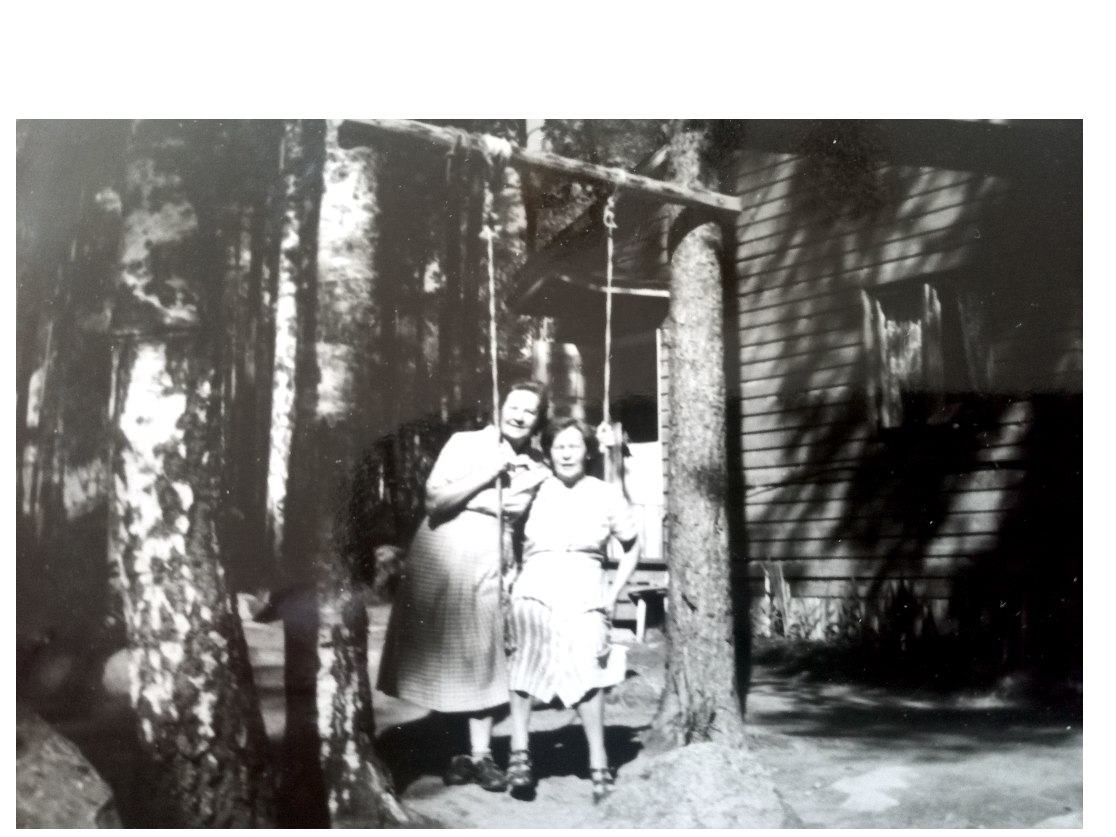 Maikki ja Liisa Särkelän pihassa. ”Kiinalaistalot” olivat saaneet nimensä kattorakenteesta. Ne olivat saaren ensimmäiset kaukolämmitteiset asuintalot. Lämpö ja kuuma vesi tulivat pannuhuoneesta ensimmäisessä talossa nykyisen Parviaisentien suunnalla.