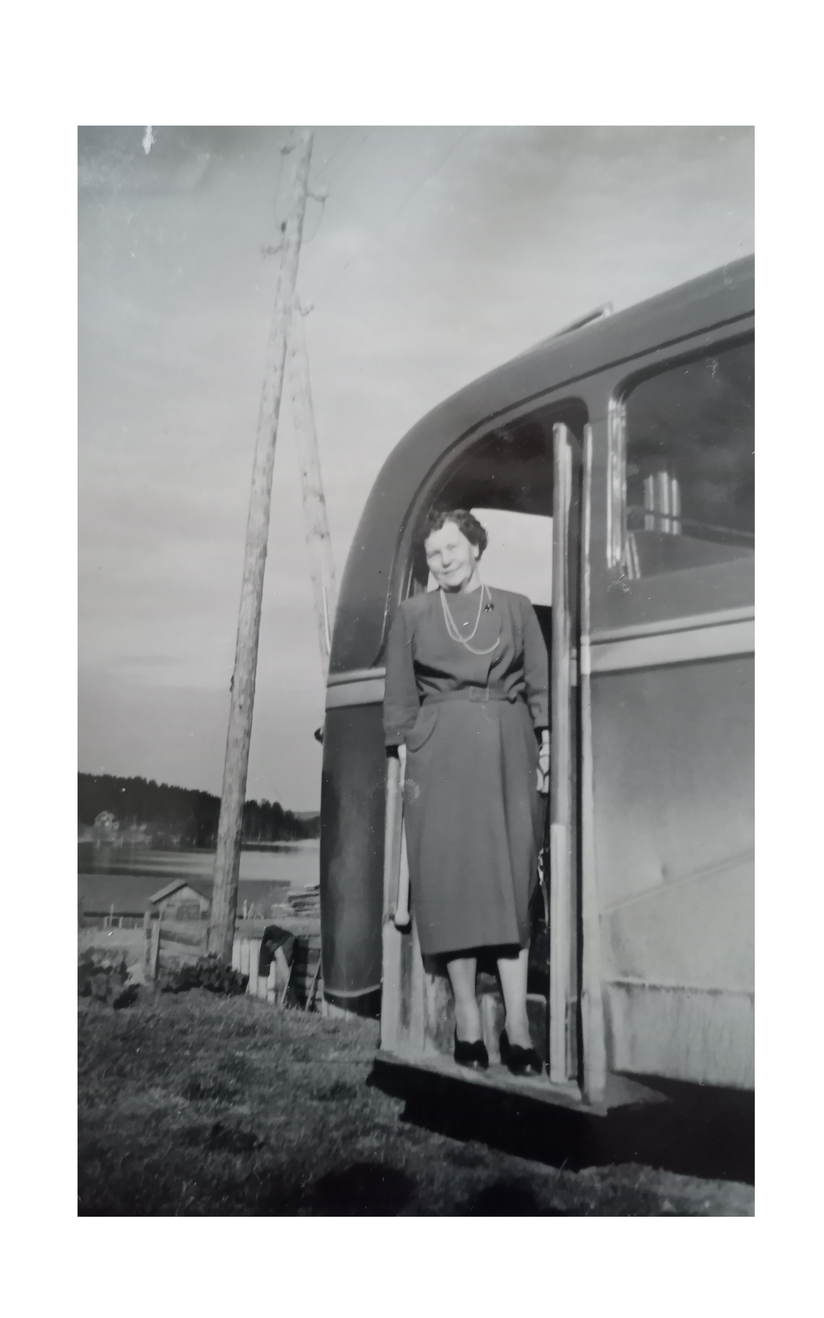 Maikki Särkijärvi oli konttorinjohtajana Jyväskylän Säästöpankin saaren konttorissa. Se oli työväenhenkisen Nisulan Osuuskassan vastapuoli täällä. Liikepankeilla ei ollut koskaan konttoreita Säynätsalossa. Kuvassa Maikki on lähdössä linja-autolla Jyväskylään.