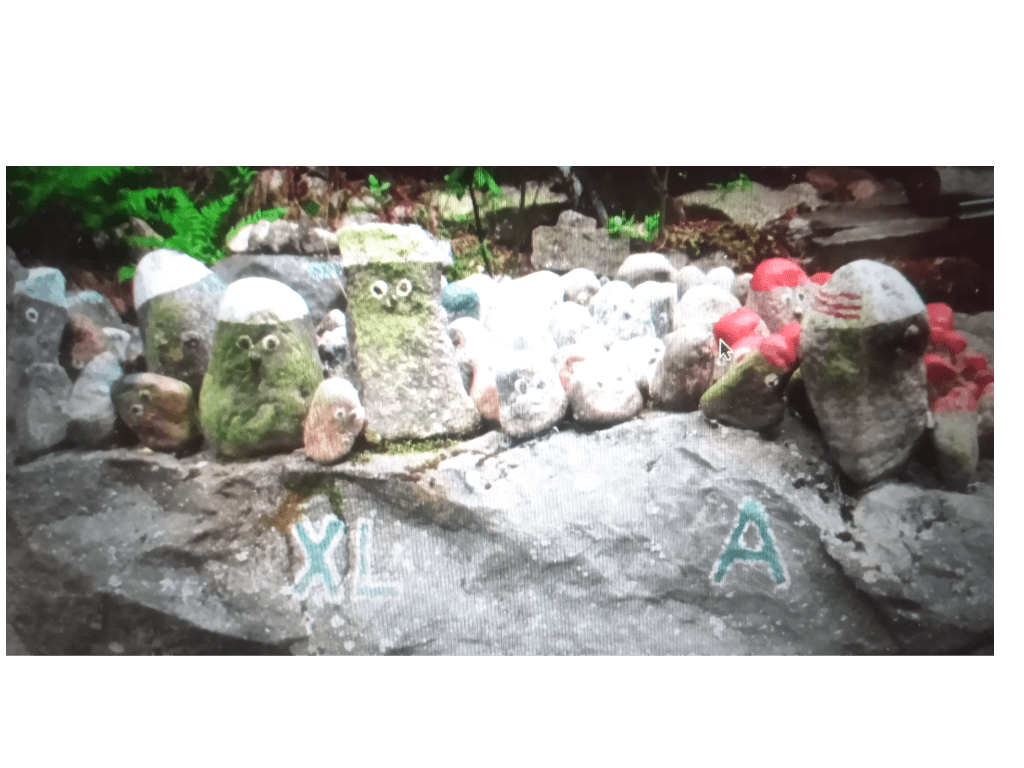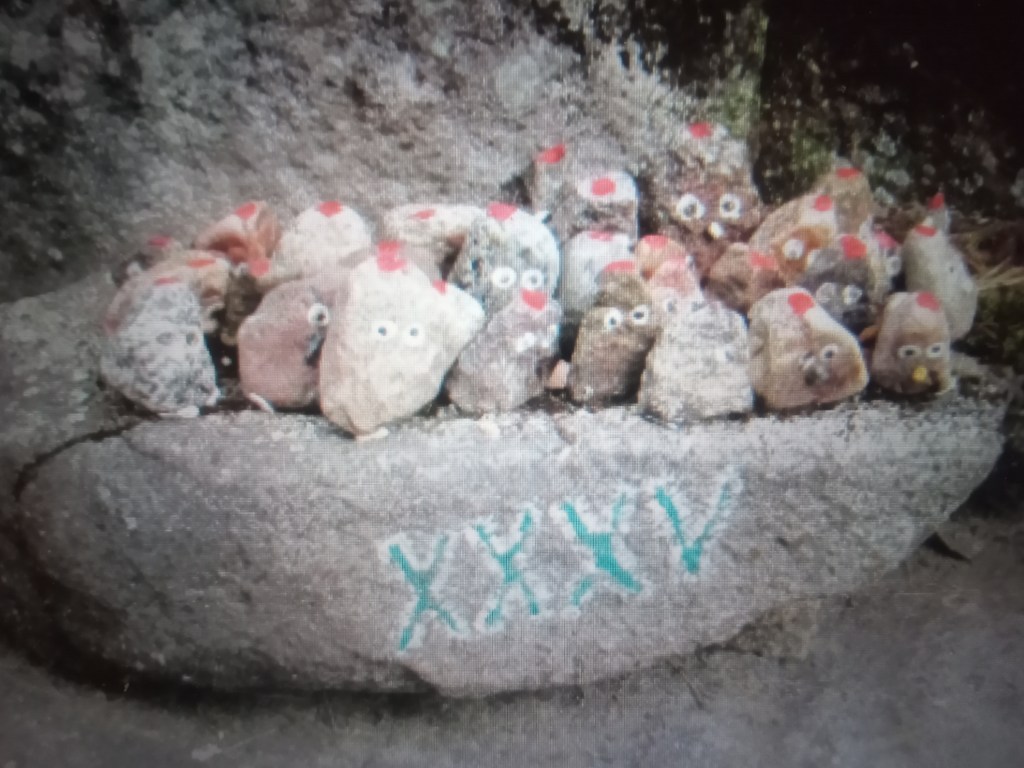 Hahmot ovat luonnonkiviä ja niitä on värittämällä tarkennettu. Mihinkään näköisyyteen ei ole pyritty.