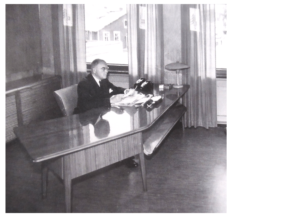 Hilmer Brommels työhuoneessaan vuonna 1949 valmistuneella konttorilla. Ikkunasta näkyy Säynätsalon ammattikoulun rakennus.