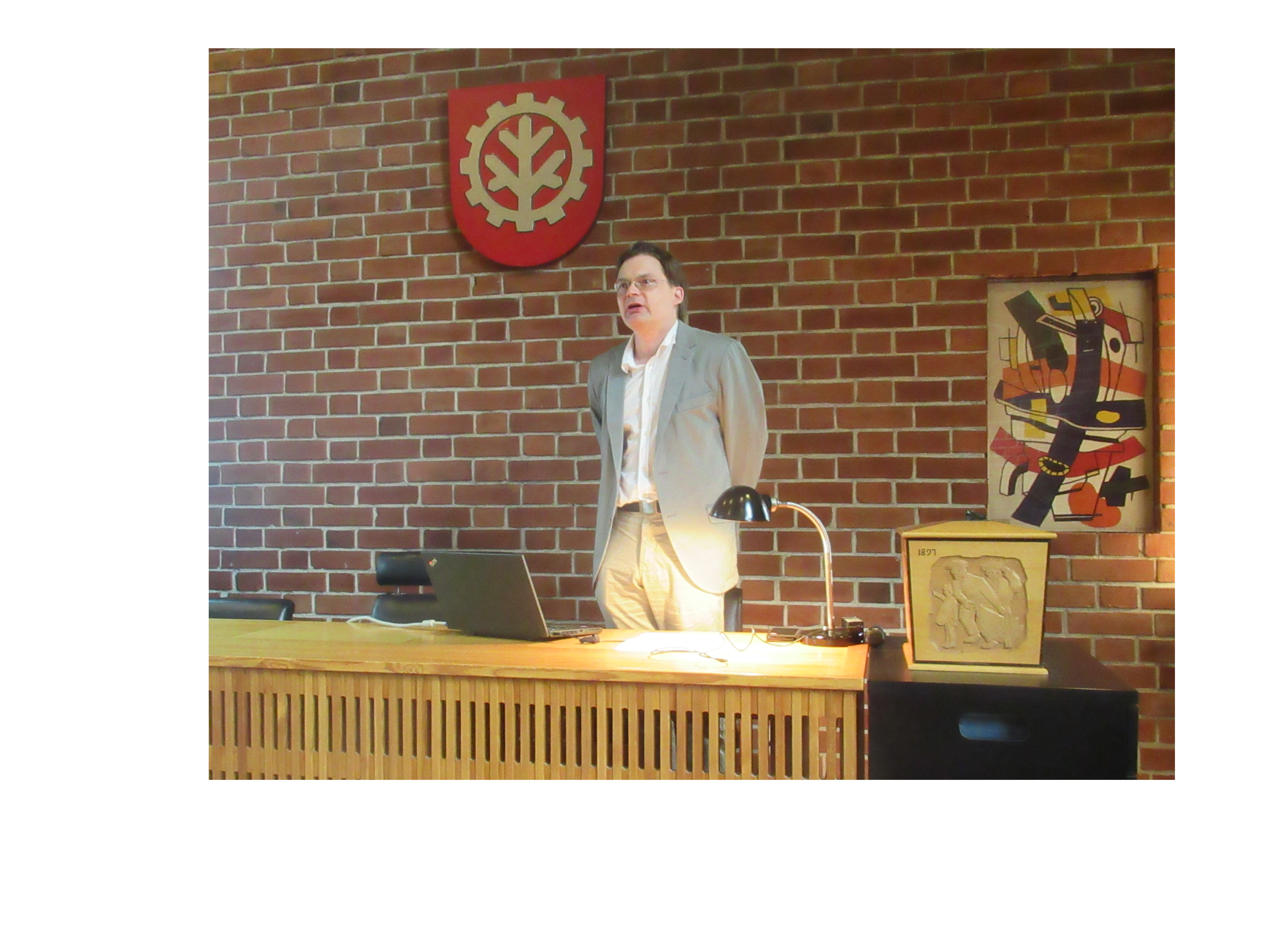 Kesken luentonsa yliarkkitehti Malmberg katsahtaa kattoon: ”Metsikkö puunjalostusteollisuuden varaan rakentuneen yhteisön talossa… Vähän kuin tämä yliviritetty kattorakennelma, täällä valtuustosalissa”.